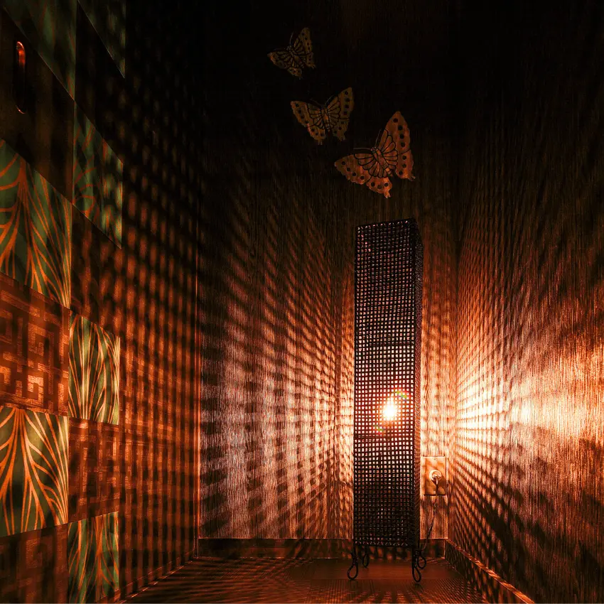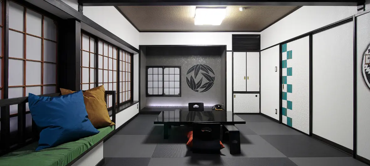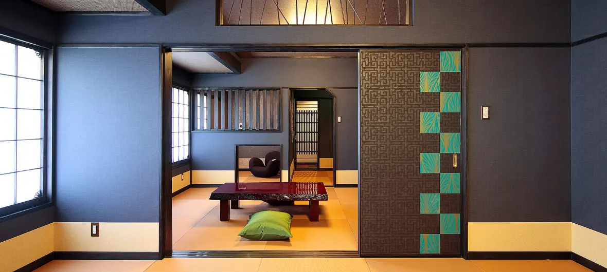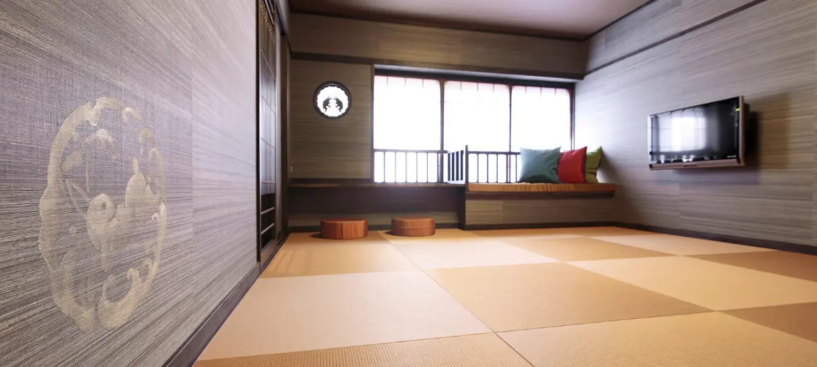 特殊加工で壁に銀色を表現した12畳の和室(定員4名様 ※ただし、4枚お布団を敷くと手狭に感じるという声をいただいておりますので、大人3名様までのご利用をおすすめしております)。