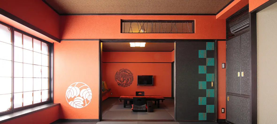 艶やかな朱色の壁が印象的な16畳の和室(定員6名様)。