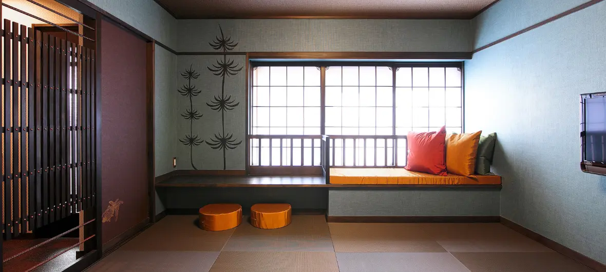 瑞々しい碧色の壁が映える8畳和室(定員2名様)。