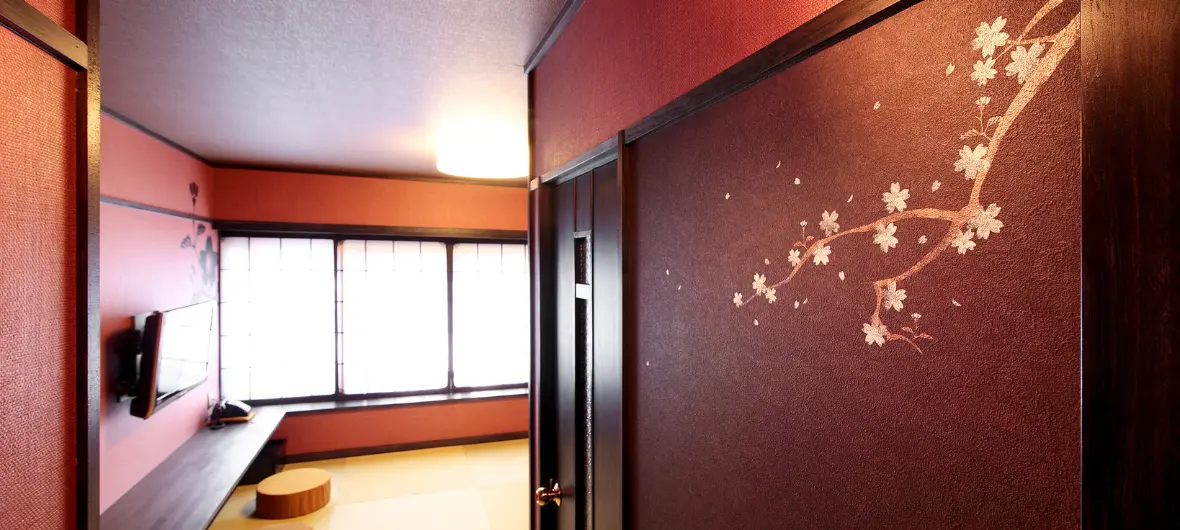 愛らしい櫻色の壁がカップルに人気の7.5畳和室(定員2名様)。