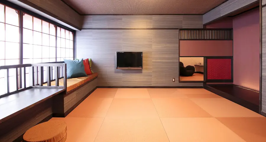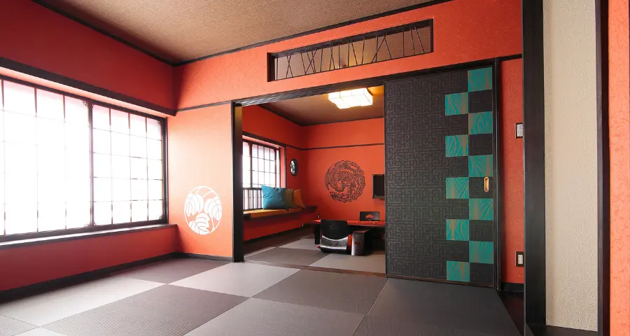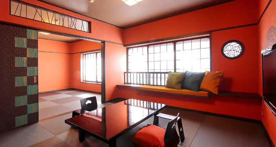 艶やかな朱色の壁が印象的な16畳の和室(定員6名様)。