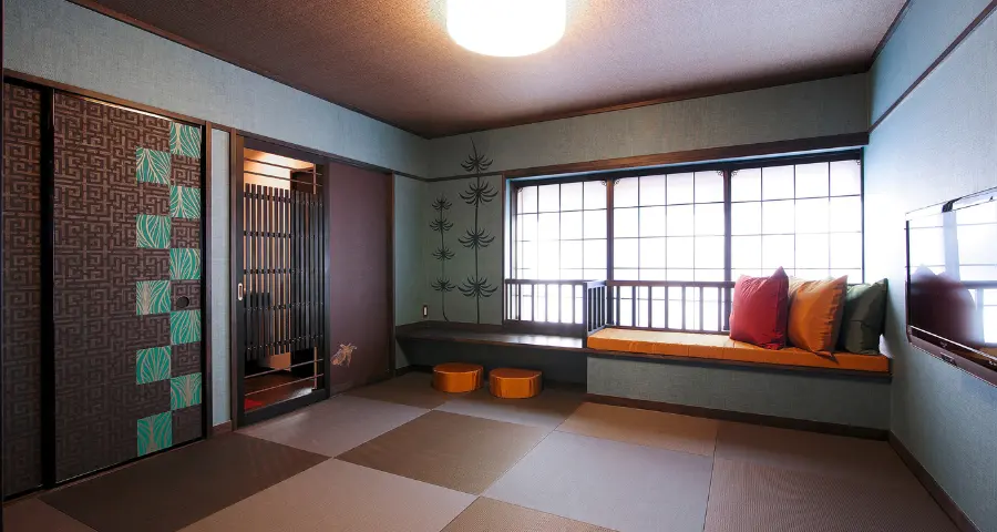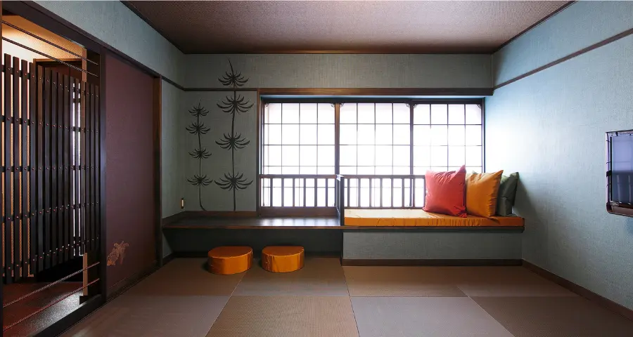 瑞々しい碧色の壁が映える8畳和室(定員2名様)。