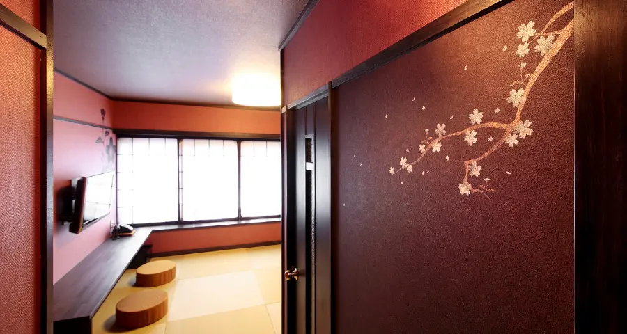 愛らしい櫻色の壁がカップルに人気の7.5畳和室(定員2名様)。