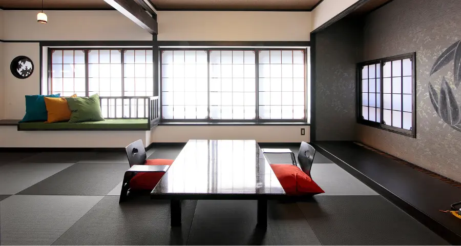 深みのある壁色が落ち着く16畳の和室(定員4名様)。